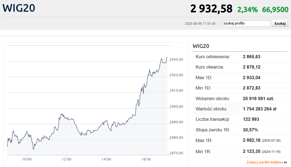 Wartość obrotu na warszawskiej giełdzie sięgnęła 2 mld zł, z czego ok. 1,77 mld zł dotyczyło spółek z indeksu WIG20. Największa wartość obrotu skoncentrowała się na akcjach Orlenu (349 mln zł), PKO BP (265 mln zł), Pekao (189 mln zł) i Żabki (183 mln zł).