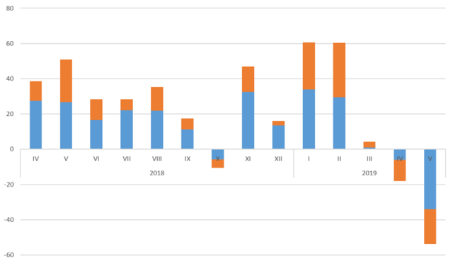 Po mocnym początku roku, gdy "zagranica" rzuciła się na przecenione walory notowane na giełdach za Murem, ostatnie dwa miesiące przyniosły realizację zysków, napędzaną przez rosnące napięcie na linii Waszyngton-Pekin. Po marcu, gdy inwestorzy lokujący środki w Szanghaju i Shenzhen za pośrednictwem giełdy w Hongkongu zarówno kupowali, jak i sprzedawali rekordowo dużo akcji, w kwietniu i maju obroty wyraźnie spadły, a sprzedaż przeważała nad zakupami.