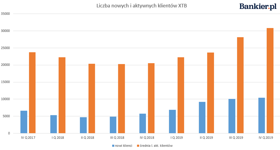 Wzrost przychodów jest efektem (jak się wydaje, patrząc na liczby) trwałej pracy nad pozyskiwaniem nowych klientów. Już od trzech kwartałów liczba nowych klientów pozyskanych przez XTB oscyluje w pobliżu 10 tys., gdy tymczasem wcześniej było to znacznie bliżej poziomu 5 tys. Widać także rosnący trend w liczbie aktywnych klientów. Jeszcze rok temu aktywni inwestorzy w XTB to była grupa 20 tys. osób, gdy tymczasem w IV kwartale rozrosła się ona do ponad 30 tys. osób.