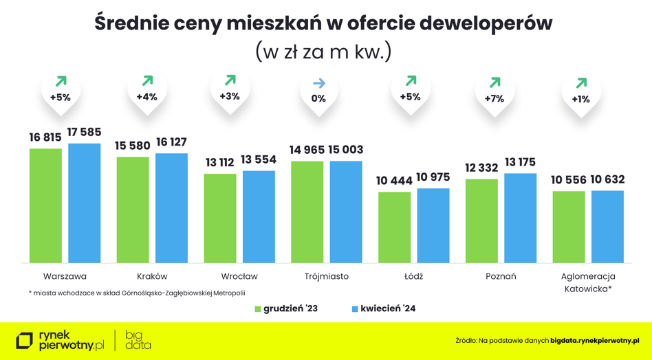 Łódź od dawna jest postrzegana jako miasto z tanim metrażem (również nowym). Widoczne na poniższym wykresie dane RynekPierwotny.pl potwierdzają, że stolica województwa łódzkiego na tle innych największych rynków wciąż jest stosunkowo tania. W kwietniu 2024 r. średnia ofertowa stawka z cennika łódzkich deweloperów zbliżała się do 11 000 zł/mkw. i była o około 5% wyższa względem grudnia 2023 r. Do grona dużych miast z droższym nowym metrażem niż Łódź, oprócz Warszawy, Krakowa, Wrocławia, Poznania i Gdańska (14 932 zł/mkw. w kwietniu br.), można zaliczyć np. Katowice (12 420 zł/mkw.), Szczecin (12 460 zł/mkw.) oraz Lublin (11 500 zł/mkw.).