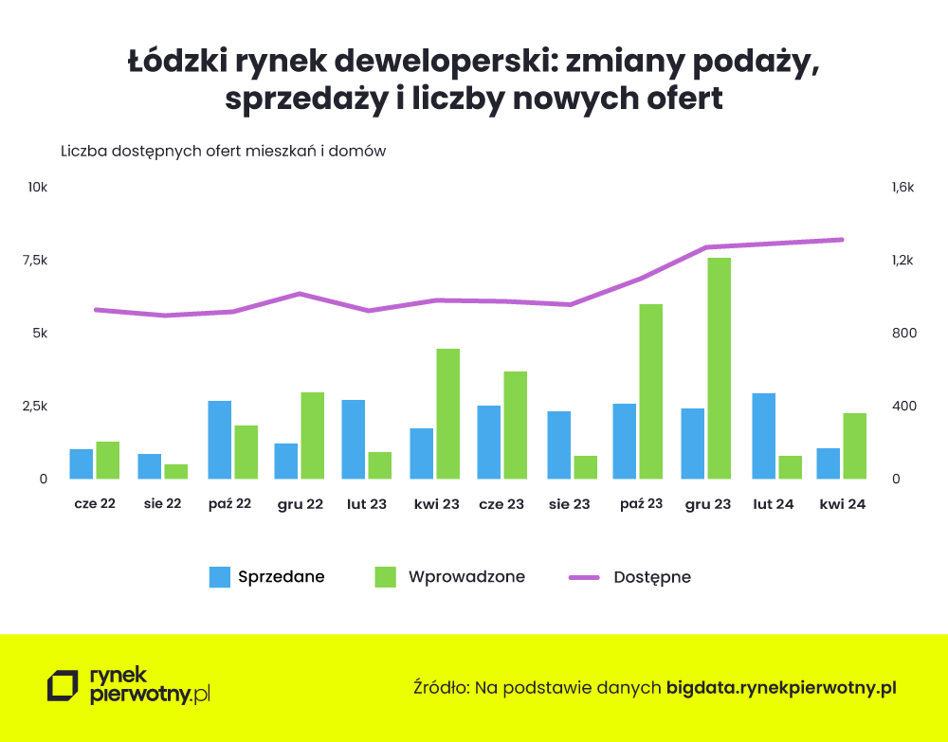 Ten kolejny wykres przygotowany przez ekspertów RynekPierwotny.pl pokazuje zmianę podaży, sprzedaży i liczby nowych ofert deweloperskich z Łodzi. Jak widać, w drugiej połowie minionego roku łódzcy deweloperzy podjęli inwestycyjną ofensywę. Po części była to odpowiedź na symptomy ożywienia rynkowego. Od sierpnia ub.r. łódzki rynek deweloperski zaczął bowiem notować lepsze wyniki sprzedażowe. Styczeń 2024 r. przyniósł rekord w postaci ok. 700 sprzedanych nowych mieszkań z Łodzi. Jednocześnie wtedy zaczęło się hamowanie inwestorów, które widzimy, obserwując liczbę ofert trafiających na rynek.