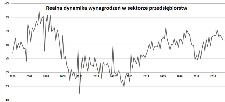 Obniżenie się nominalnego wzrostu płac przy utrzymującej się blisko 2% oficjalnie raportowane inflacji CPI oznacza postępujący spadek dynamiki realnych wynagrodzeń. We wrześniu realny wzrost tzw. średniej krajowej wyniósł 4,69% wobec 4,71% miesiąc wcześniej. Choć to wciąż wynik wysoki na tle historycznej średniej, to jednak jest to rezultat najniższy od listopada 2017 roku.