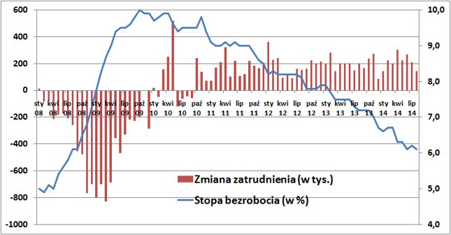 Obliczana w odrębnym badaniu stopa bezrobocia w USA obniżyła się do z 6,2% do 6,1% i był to wynik zgodny z prognozami ekonomistów. Ta część raportu BLS powstała na bazie ankiety wśród dużej próby gospodarstw domowych i pokazała wzrost liczby zatrudnionych zaledwie o 16 tys. oraz spadek liczby bezrobotnych o 80 tys. Aż 268 tys. Amerykanów wypadło ze statystyk siły roboczej. Ludzie ci zaniechali aktywnego poszukiwania zatrudnienia. W efekcie współczynnik partycypacji w rynku pracy zmalał do 62,8% wobec 63,2% przed rokiem.