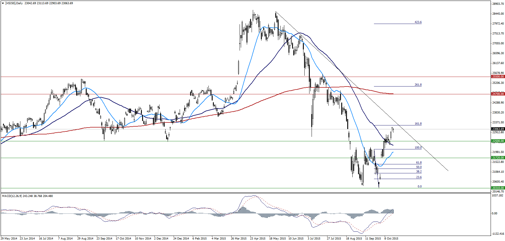 Odczyty danych makroekonomicznych z Chin, które znów zawiodły inwestorów, ze wzrostem produkcji przemysłowej o 5,7% przy prognozie 6% na czele, wyhamowały wzrosty w Hong Kongu. Drugą sesję z rzędu widzimy niepewność tuż pod zniesieniem fibo 161,8 ostatniej fali spadkowej, niedaleko linii trwającego od końca maja południowego trendu. Przełamanie tego obszaru jest kluczowe dla dalszych wzrostów na HSI50. Jeżeli bykom udałoby się tego dokonać, zostałaby stworzona duża szansa na atak na opór 24700 pkt. oraz 200-okresową średnią kroczącą. Jeżeli jednak informacje napływające z Chin nie ulegną poprawie obecne zatrzymanie może oznaczać koniec optymizmu na hongkońskim parkiecie.