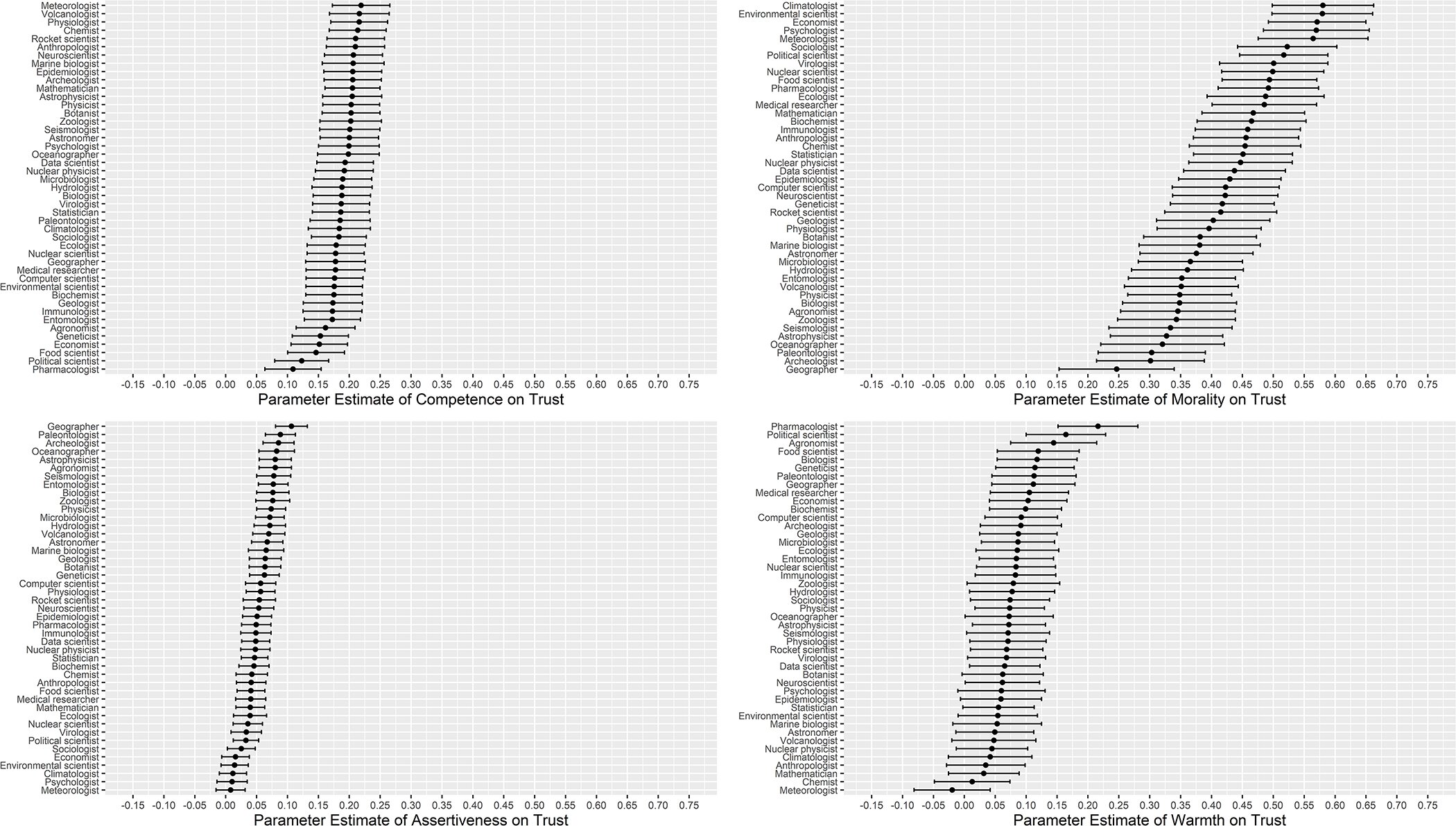 Zastosowano 7- punktową skalę, w której wynik 7 oznaczał najwyższe zaufanie do danej strony, że rozwiąże ona problem, zaś 1 kompletny brak wiary, że sobie z nim poradzi. Po podsumowaniu wyników okazało się, że najniższe noty na poziomie 3,71 i 4,28 otzrymywali politolodzy i ekonomiści, z kolei najyższe zaufanie na poziomie 5,53 i 5, 54 okazywano neurobiologom i biologom morskim.