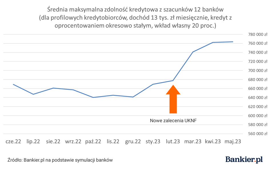 Banki zareagowały na możliwość skorygowania parametrów stosowanych podczas weryfikacji zdolności kredytowej. Na początku roku średnia maksymalna zdolność wyliczana dla propozycji kredytodawców w rankingu Bankier.pl zbliżona była do 670 tys. zł. Ten sam profil kredytobiorców w maju mógł liczyć na finansowanie w wysokości 763 tys. zł.