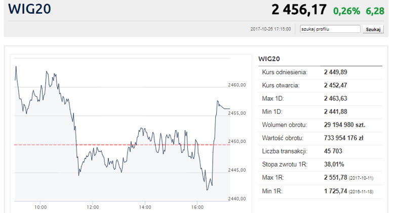 | WIG 20 | Polska | 2456,17 | 0,26 | -0,46 | 0,53 | 38,01 | 26,09 |