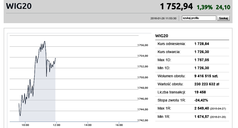 Na tym tle wyróżniał się m.in. WIG20. Rodzimy indeks tuż przed godziną 12 rósł o 1,4%. Dobrze prezentował się także szeroki rynek, WIG zyskiwał 1,2%. Wzrosty na mWIG-u sięgały 1%.