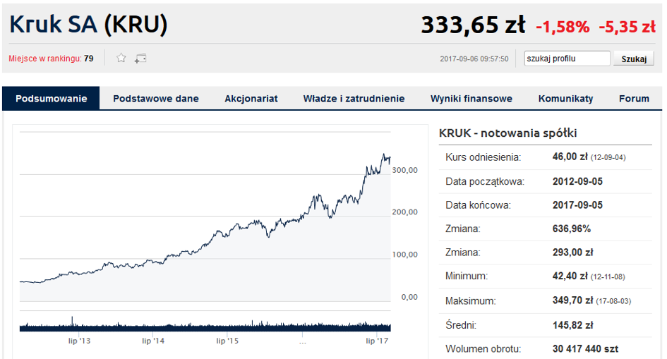 W pierwszym półroczu 2017 r. przychody Kruka wzrosły z 341 do 547 mln złotych (+60%). Zysk netto natomiast w tym czasie się aż podwoił, rosnąc ze 111 do 217 mln złotych. Publikując półroczny raport spółka skorygowała także podawane wcześniej wyniki z I kwartału (podniesiono zarówno zysk netto, jak i przychody).