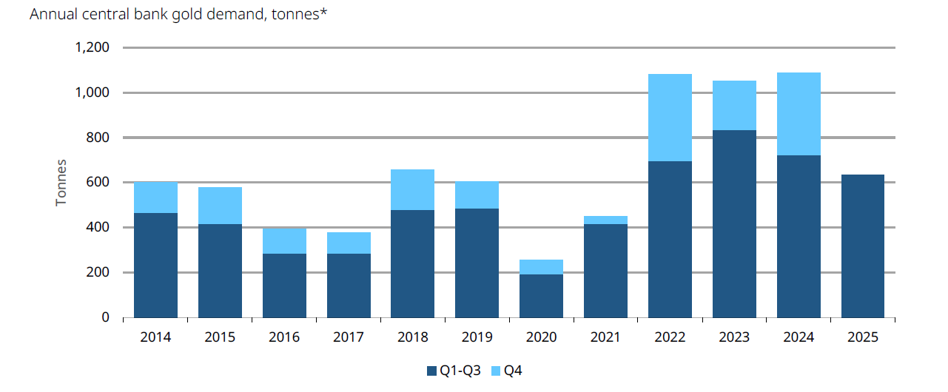 Kontynuując wątek zakupów złota przez banki centralne, najnowszy raport sugeruje, że rok 2025 może być pierwszym od trzech lat, w którym łączne zakupy ze strony tych instytucji nie przekroczą 1000 ton, jak to miało miejsce w latach 2022-2024.