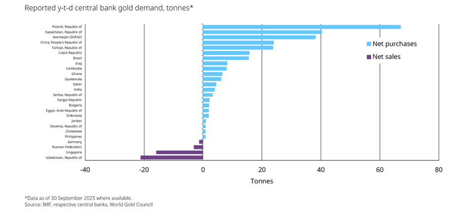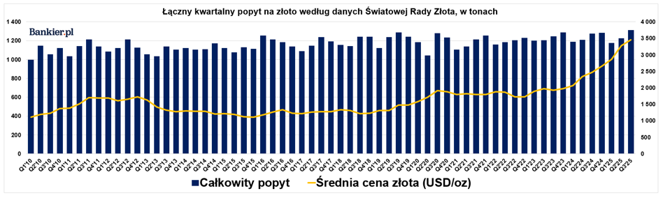 Światowa Rada Złota podała, że trzeci kwartał 2025 r. wygenerował rekordowy popyt na złoto w historii zbierania danych. Ogromne zakupy sztabek i monet przekroczyły 300 ton, a do tego 222 ton kupiły złote ETF-y. Silny pozostał popyt ze strony banków centralnych, wśród których największym kupującym w 2025 r. pozostaje polski NBP, a do klubu zwiększających rezerwy dołączyły nowe banki.