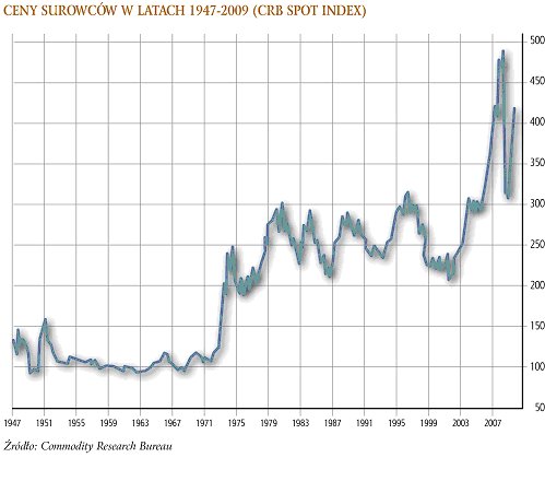 Fakty mówią jednak same za siebie: obligacje rządowe dały zarobić blisko 90 proc., nieco więcej zyskały na wartości bardziej ryzykowne obligacje korporacyjne, natomiast strzałem w dziesiątkę okazały się surowce. Od początku 2000 r. do końca grudnia 2009 r. szeroki indeks rynku surowców wzrósł aż o 257 proc. Duży udział w wypracowaniu tak spektakularnej stopy zwrotu miał systematyczny wzrost cen energii – ropa naftowa podrożała w analizowanym okresie o niemal 190 proc., jednak zdecydowanym hitem pierwszej dekady XXI wieku okazało się złoto. Każde 1000 dolarów ulokowane w ten metal szlachetny po dziesięciu latach warte było ok. 2800 dol. W tym miejscu warto przypomnieć maksymę, że w świecie inwestycji nie ma darmowego lunchu – wyższe zyski uzyskują najczęściej ci, którzy godzą się na ponadprzeciętne ryzyko. Na załączonym wykresie widać, jakim ogromnym wahaniom na przestrzeni kilku dekad podlegały ceny towarów. Indeks CRB obejmuje ceny 23 surowców i towarów, oprócz ropy naftowej, miedzi czy stali, duży udział mają w nim produkty rolne takie, jak kukurydza, kakao, cukier czy olej sojowy.
