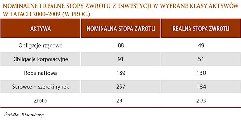 Z kontrariańskiego punktu widzenia (większość się myli), inwestorom, którym obecnie niemal na każdym kroku poleca się inwestycje w rynki wschodzące i rynki surowcowe, warto jeszcze raz zwrócić uwagę na załączony wykres. Ktoś rozpoczynając dziś inwestycję o dziesięcioletnim horyzoncie czasowym, np. w fundusz rynku złota powinien liczyć się z faktem, że być może startuje z podobnych poziomów, jak rynki akcji w 2000 r. Jeżeli po ostatniej dekadzie można postawić tezę, która obroni się w ciągu najbliższych kilku czy kilkunastu lat, to będzie to stwierdzenie, że rynki wracają do długoterminowych średnich. Najlepiej zawsze można zarobić na aktywach, których wykresy przypominają hiperbolę, ale im bardziej staje się to widoczne, tym większa szansa, że będziemy ostatnimi, którzy gaszą światło.