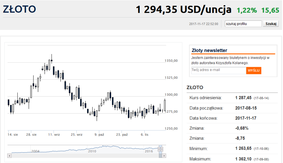 Kurs złotych kontraktów wzrósł o 1,2 proc., kończąc sesję na wysokości 1294,35 dolarów za uncję. Ostatni raz równie wysoką cenę złota odnotowano dokładnie 17 października.