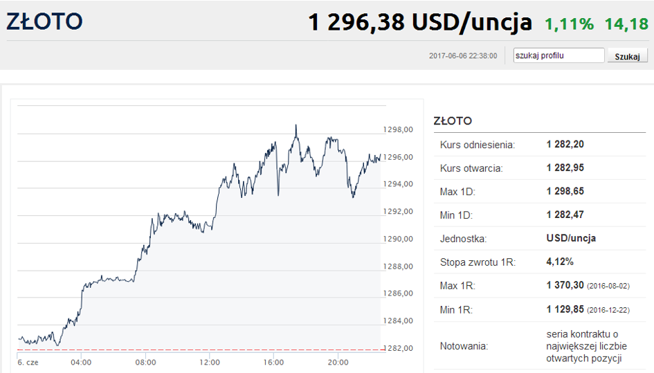 Pod koniec wtorkowych notowań za uncję złota płacono 1.296,38 USD. To o 1,1% więcej niż dzień wcześniej. Wcześniej w trakcie sesji kurs królewskiego metalu dotknął 1.298,65 dolarów i znalazł się najwyżej od słynnej „świeczki Trumpa” z 9 listopada (tego dnia śródsesyjne maksimum wypadło na 1.337 US/oz, ale zamknięcie na zaledwie 1.277 USD/oz).