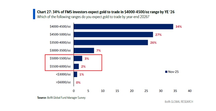 W tym czasie na rynku pojawiło się kilka prognoz, które podtrzymują scenariusz braku głębszej korekty i utrzymania ceny przynajmniej powyżej 4000 dolarów do końca 2026 r. Tak przynajmniej wynika z Global Fund Manager Survey, czyli comiesięcznego badania nastrojów i pozycji inwestycyjnych globalnych zarządzających funduszami, które przeprowadza Bank of America.