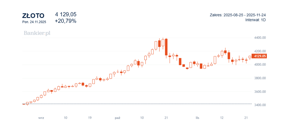 W ostatnich tygodniach grudniowa obniżka stóp znów jest scenariuszem, który na rynku terminowym ma większe szanse powodzenia, stąd złoto faktycznie na razie wygląda, jakby zakończyło korektę, w międzyczasie meldując się powyżej 4200 dolarów, a w ostatnich dniach jest notowane płasko, powyżej 4100 dolarów za uncję trojańską. W listopadzie cena złota zyskała na razie około 1,6 proc. po wzroście o 3,7 proc. w paźdzerniku i 11,8 proc. we wrześniu. Od początku roku dolarowa stopa zwrotu na złocie sięga 56 proc.
