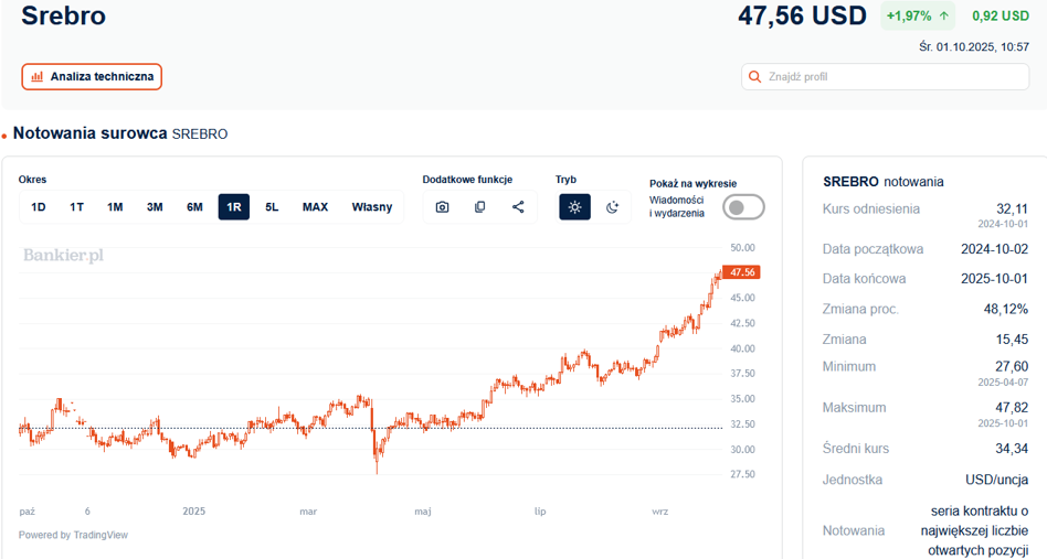 Warto dodać, że krok w krok za złotem od kilku miesięcy podążają też notowania srebra. Biały metal wyceniany był dziś na 47,82 USD/ czyli najwyżej od wiosny 2011 roku. Kurs srebra znalazł się blisko historycznych rekordów ze stycznia 1980 i kwietnia 2011 roku – oba leżące w okolicy 50 USD/oz.