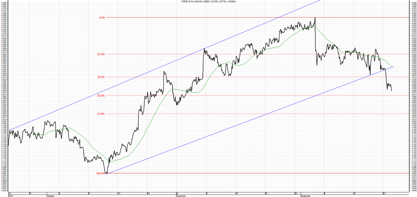 Kurs USD/PLN w połowie października wybił się z trendu bocznego we wzrostowy. Nowym oporem są maksima na 4,0450. Dla ewentualnego ruchu w dół najbliższym wsparciem minima lokalne na 3,9400 od których kurs już dwukrotnie się odbijał.