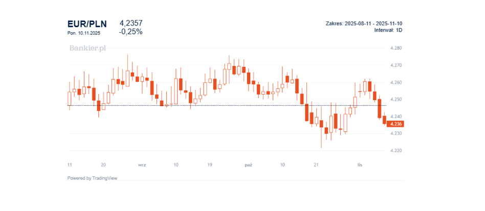 Złoty został wzmocniony tymi dwoma wydarzeniami, zatem kurs EUR/PLN zszedł z poziomu 4,2623 zł widziany jeszcze w środę 5 listopada do 4,2356 zł notowanych w poniedziałek 10 listopada dziesięć minut po godzinie 10.00. Względem piątkowego zamknięcia złoty umacniał się jednak dość nieznacznie, zyskując rano w granicach 0,1 proc.