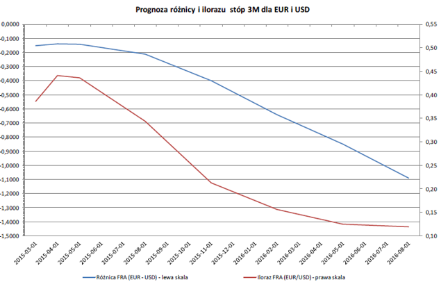 Za taką prodolarową prognozą przemawia poniższy wykres – wykres różnicy pomiędzy oprocentowaniem euro i dolara. Przy czym nie są to bieżące stawki EURIBORU i LIBORU, lecz bieżące stawki kontraktów futures oraz FRA. Innymi słowy jest to obraz oczekiwań uczestników dwóch rynków stóp procentowych, oczekiwań co do przyszłych losów stop procentowych w USA i eurolandzie.
