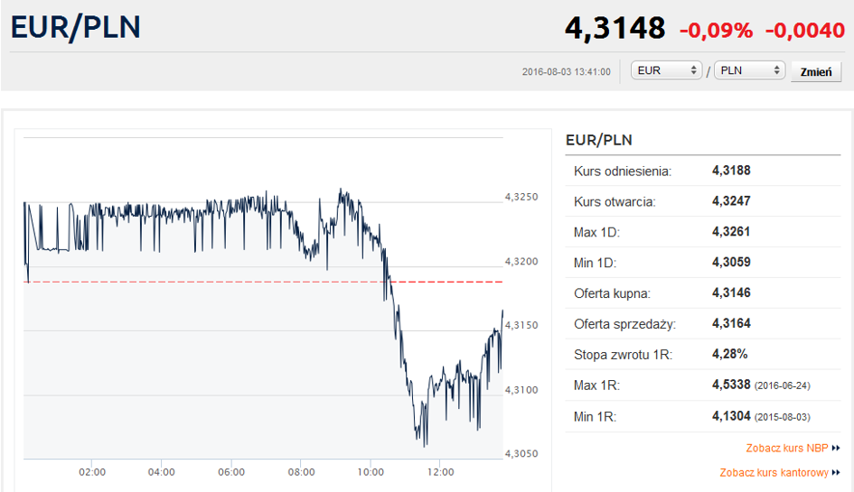 O 13:45 za euro trzeba było zapłacić 4,3155 złotego, czyli o pół grosza mniej niż na zamknięciu wtorkowych notowań. Wcześniej notowania pary euro-złoty spadły nawet do 4,3058 zł.