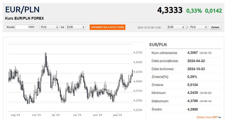 Kurs EUR/PLN wynosił w środę o godz. 9.13 aż 4,333 zł i był najwyżej od 19 czerwca, czyli jeszcze zanim zaczęły się wakacje i astronomiczne lato. Słabość złotego jest w ostatnich dniach znacząca i jest konsekwencją przede wszystkim z umocnienia dolara, który zyskuje na rosnących szansach Donalda Trumpa na zwycięstwo w wyborach prezydenckich, dobrych danych gospodarczych z amerykańskiej gospodarki. Złotego na dodatek osłabił fatalny wynik sprzedaży detalicznej za wrzesień opublikowany przez GUS, który w opinii ekonomistów oznacza, że „konsument umarł”.