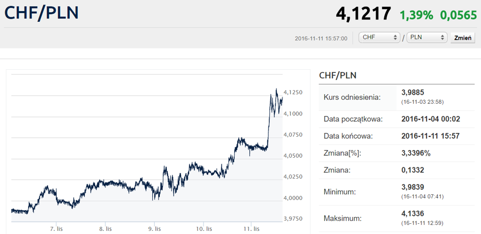 Nie mamy też niestety dobrych wiadomości dla frankowców, kurs CHF/PLN przekroczył bowiem barierę 4,10 i chwilę po godzinie 10.00 wynosił 4,1131. Podobnie jak w przypadku euro, jest to najwyższy poziom od lipca. Warto odnotować, że od 1 listopada frank szwajcarski umocnił się o prawie 12 groszy.