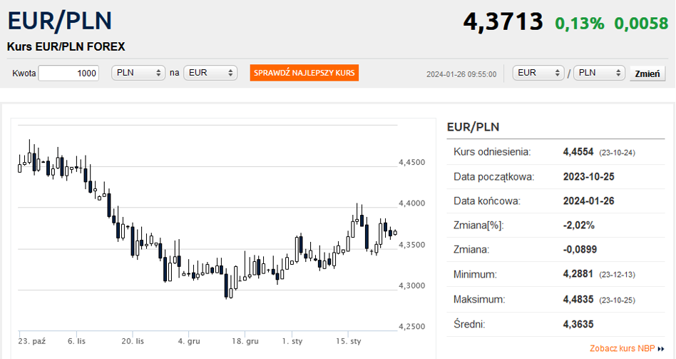 W piątek rano kurs euro wynosił 4,3713 zł i był o ponad pół grosza wyższy niż dzień wcześniej. Za nami dwa dni względnego spokoju na rynku złotego po tym, jak przez poprzednie kilka dni doświadczyliśmy podwyższonej zmienności, kiedy to kurs EUR/PLN potrafił się wahać o 2-3 grosze w ciągu doby.