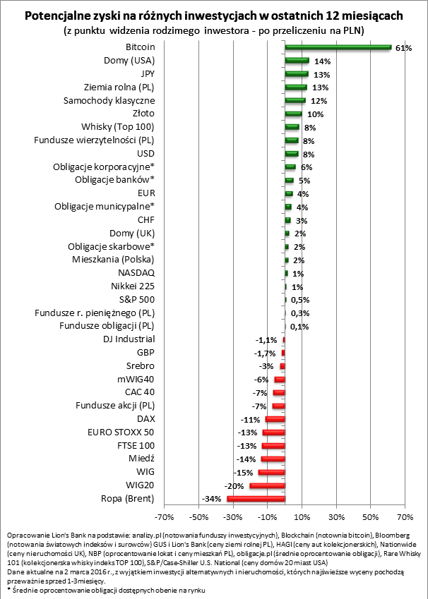 Najwyższy zysk może natomiast dziś zrealizować inwestor, który rok temu wymienił pieniądze na wirtualną walutę bitcoin. Jej notowania charakteryzują się potężną zmiennością, ale dziś rodzimego inwestora może ona cieszyć. Nie powinno to dziwić, skoro rok temu płacono za nią 282 dolary, a dziś 423, czyli o połowę więcej. Gdyby do tego dodać fakt, że dolar jest dziś droższy niż przed rokiem, to potencjalny roczny zysk przekroczyłby 60%.