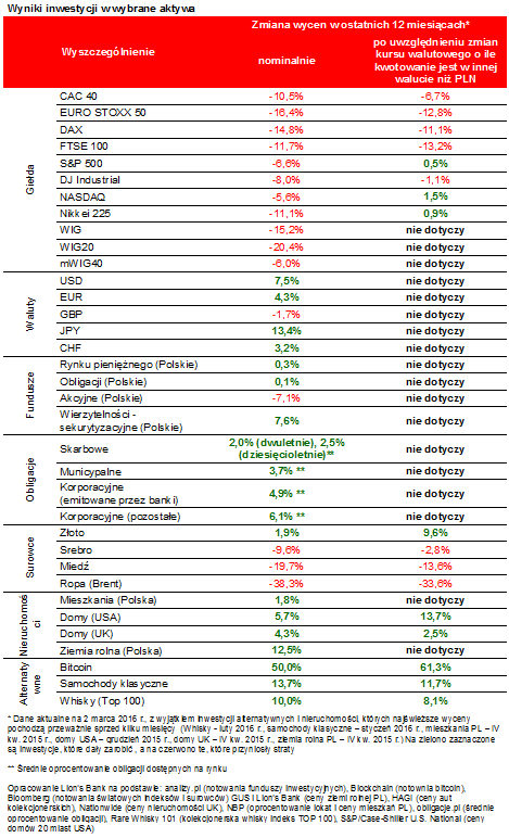 Rekordowo niskie stopy procentowe skłaniają do lokowania pieniędzy w coraz mniej konwencjonalny sposób. Może to być też jeden z powodów, dla których gwałtownie rosną w ostatnim czasie wyceny dóbr kolekcjonerskich (np. samochodów i trunków). W niespokojnych czasach inwestorzy szukają także bezpiecznej przystani w złocie i nieruchomościach. Pewnie też dlatego inwestorzy, którzy na tych rynkach ulokowali przed rokiem swoje pieniądze powinni dziś liczyć zyski – wynika z danych zebranych przez Lion’s Bank.
