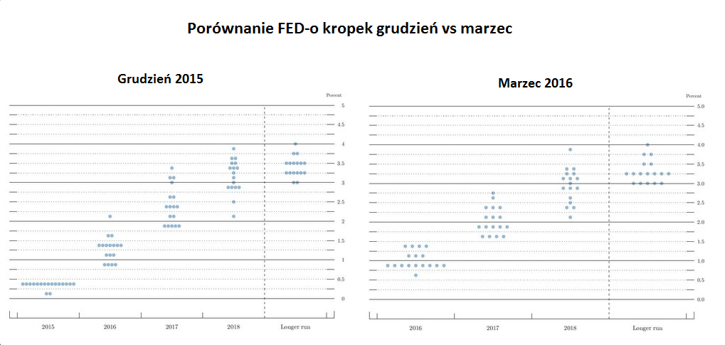 Mediana prognoz dla 2016 na grudniowym posiedzeniu wynosiła 1,375%, natomiast teraz wynosi 0,9%. Oznacza to, że FED zamierza dokonać 2 podwyżek w przyszłym roku. Niemniej jednak Janet Yellen podkreśliła na konferencji, że dot chart nie przedstawia wyłącznie planu FED, a ten z kolei się nie zmienił. Mediana stóp procentowych dla 2017 roku również została zrewidowana w dół. Mediana z grudniowego posiedzenia wynosiła 2,375%, wobec aktualnych 1,9%.