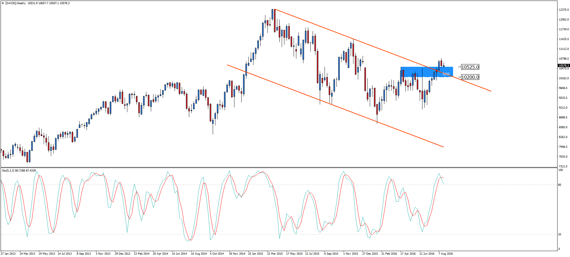 W ostatnich trzech tygodniach zaszło sporo zmian na tygodniowym wykresie indeksu DAX 30. Od kilku miesięcy niemiecki indeks poruszał się w kanale spadkowym. Po mocnej walce kupujący na dobre się zadomowili i udało im się pokonać górne ograniczenie kanału spadkowego oraz strefę oporu 10200-10525.
