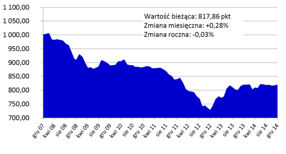 W 2014 roku średnie ceny transakcyjne mieszkań obniżyły się o 0,03 proc., a zmiana miesięczna (grudzień 2014 r. wobec listopada 2014 r.) wyniosła 0,28 proc. - grudniowe notowanie Indeksu Cen Transakcyjnych Home Broker i Open Finance to 817,86 punktów. Wyliczany na podstawie transakcji na rynku mieszkaniowym dokonanych przez klientów Home Broker i Open Finance indeks pokazuje zmianę realnych (transakcyjnych) cen na rynku mieszkaniowym w największych miastach Polski.