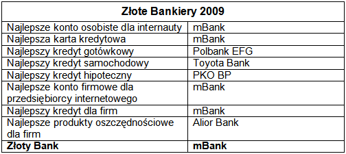 Największym zwycięzcą plebiscytu okazał się mBank – Internauci wyróżnili go aż w czterech kategoriach, przyznając mu tym samym tytuł Złotego Banku 2009 roku. Zdaniem Internautów mBank oferuje najlepsze konto osobiste, kartę kredytową, konto firmowe oraz kredyt firmowy.