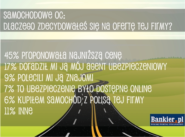 Wielu kierowców przyzwyczaiło się (a wykazała to już poprzednia edycja badania), że wybiera się to samochodowe OC, które jest najtańsze. Tegoroczne badanie potwierdziło, że cena nadal pozostaje wiodącym kryterium wyboru firmy ubezpieczeniowej (45%). Drugim silnym źródłem wpływu pozostają agenci ubezpieczeniowi (16%). O połowę mniej osób zdecydowało się na zakup ostatniej polisy pod wpływem rekomendacji znajomych i bliskich (8%).