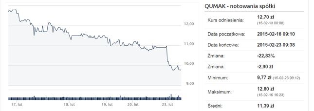 Chwilę po rozpoczęciu sesji akcje Qumaka były wyceniane na 9,77 zł. To o 11% mniej niż podczas piątkowego zamknięcia (10,98 zł). To kontynuacja słabej passy tej spółki. Jeszcze w zeszły poniedziałek (16.02.2015) jeden papier Qumaka kosztował 12,80 zł.